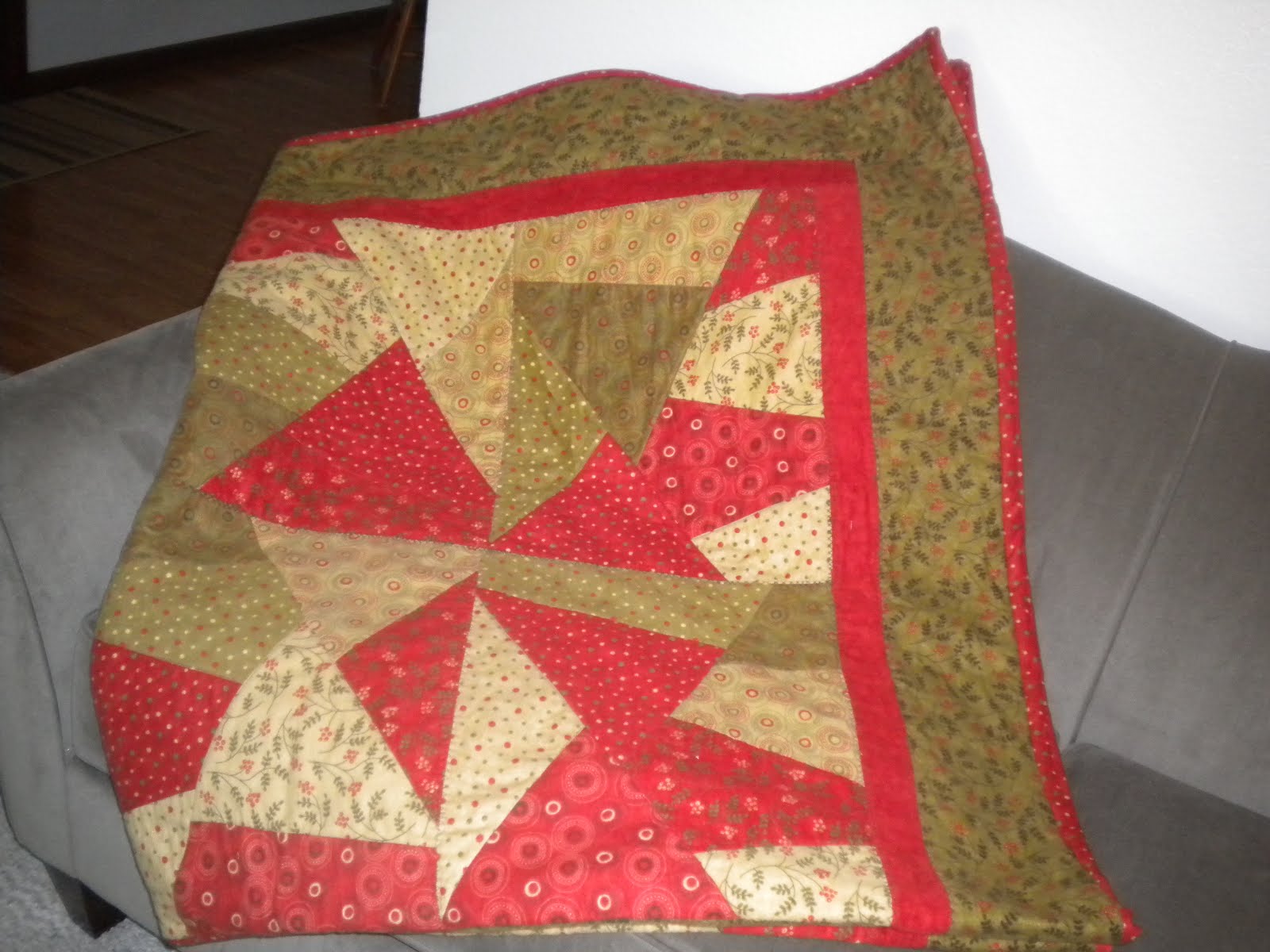 I started a Crazy Quilt made from flannel at the "Ladies of the Lake Quilt retreat in 2010. I pieced it all during the retreat and then brought it home a added the back. There it sat for almost 2 years. My intentions were good but there are always new projects. This spring I quilted it on my machine and yesterday I decided to finish it. I sewed the edge of the border on and then hand sewed the other side of the border. It is done and I am wondering what took so long. It will be nice and warm for someone to sleep under this winter.